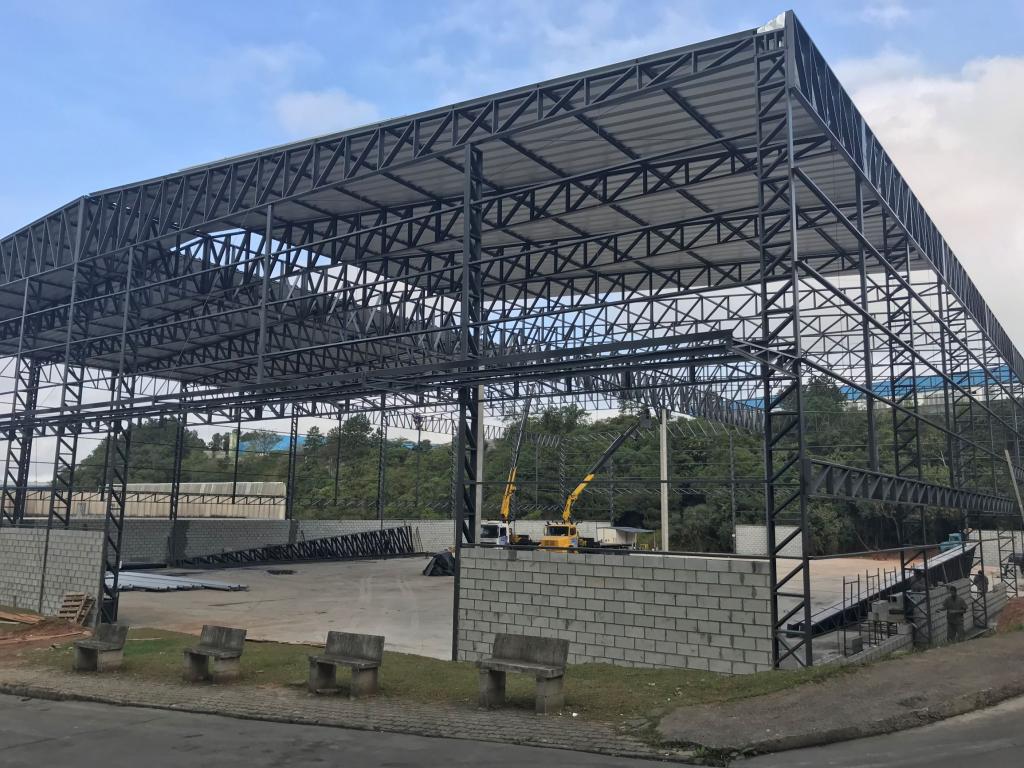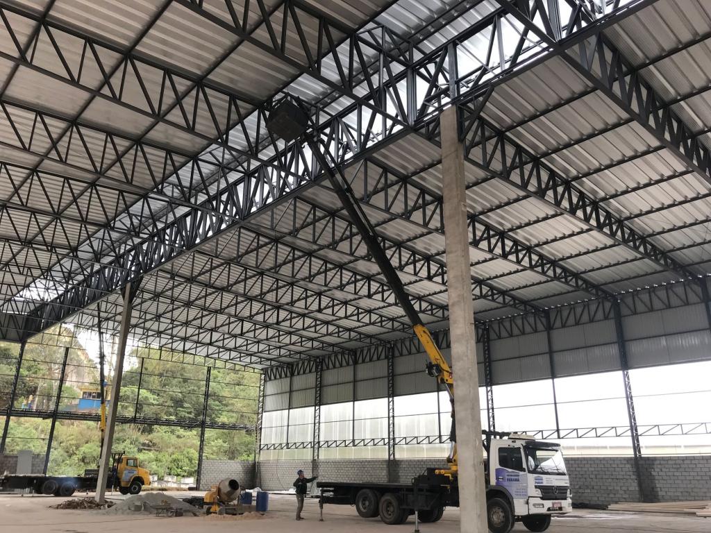 Pilares metálicos e estrutura da cobertura com treliça metalicas no centro do galpão ficando com apenas dois pilares no centro;